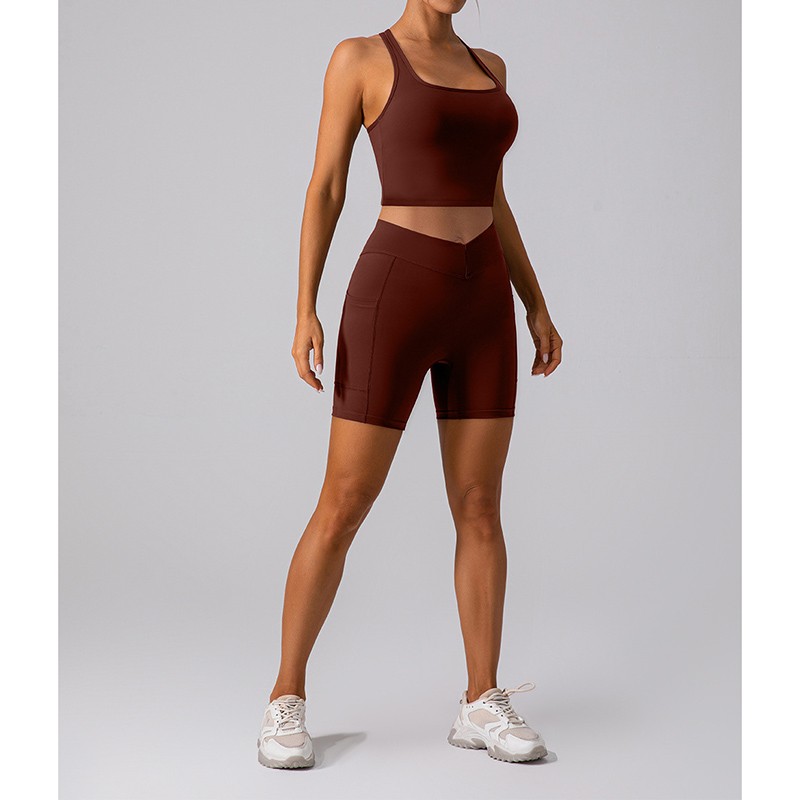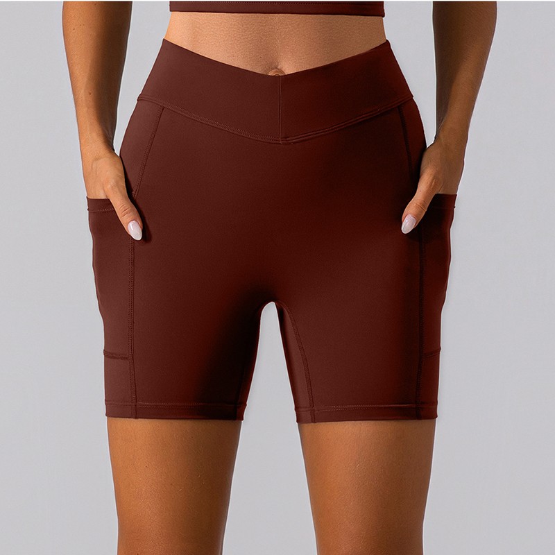 Shorts de corrida esportivos de alta elasticidade por atacado. Mulher push up v cintura bolso lateral shorts de ioga para mulheres. Você também pode personalizar seus próprios shorts femininos marrons de acordo com suas necessidades específicas.